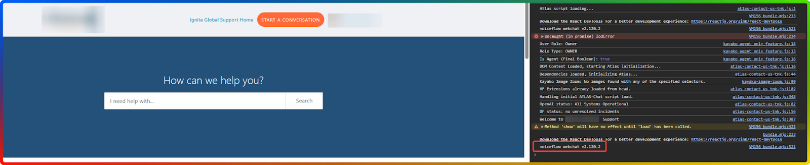 - If the Console doesn’t contain an entry like "voiceflow webchat v2.xxx.x" it is an indicator that network requests to the Voiceflow domain are blocked, which prevents the widget from loading and rendering